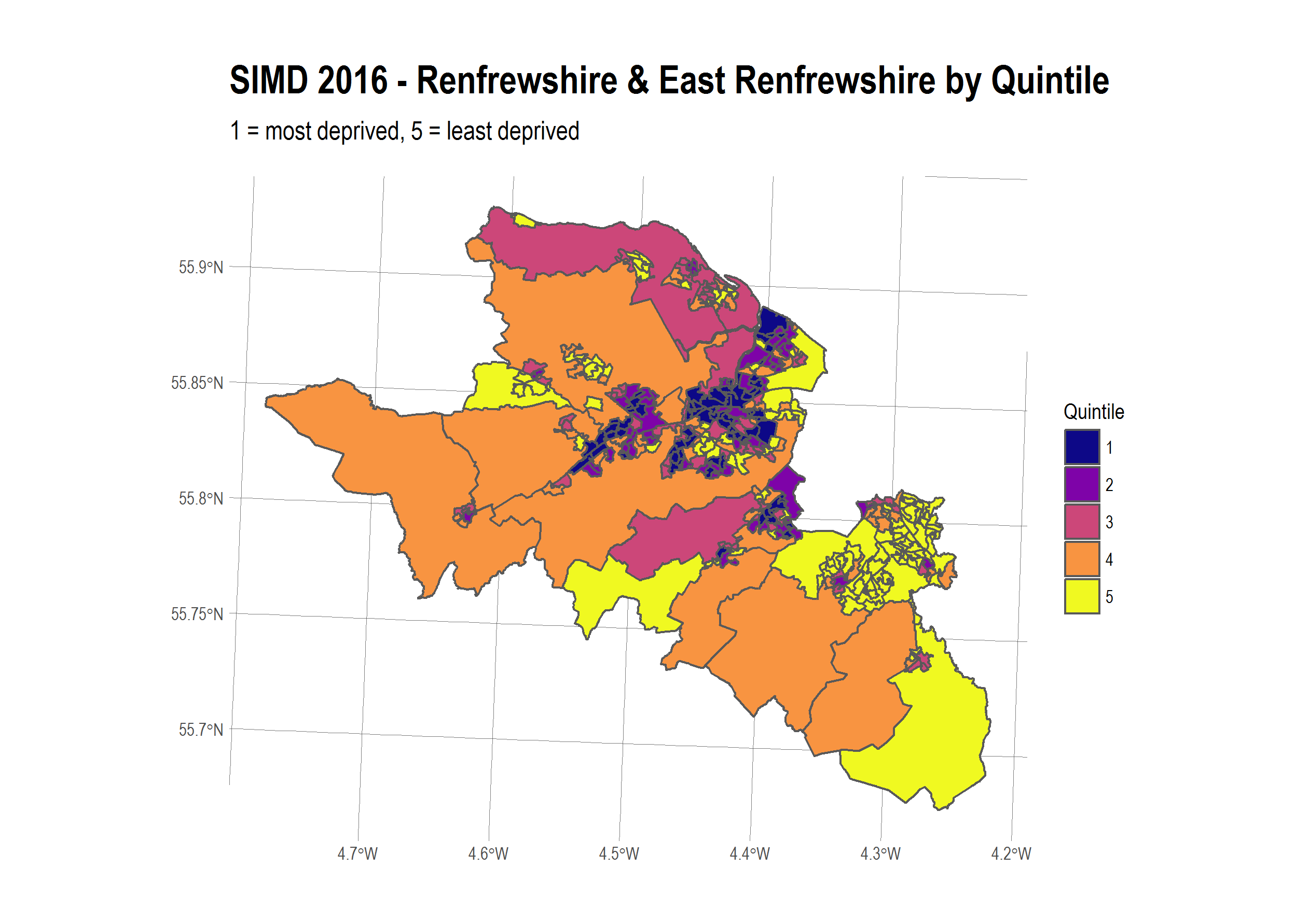 renfrew <- filter(scot,laname %in% c("East Renfrewshire","Renfrewshire")) ggplot(renfrew) + geom_sf(aes(fill = quintile)) + scale_fill_viridis("quintile", option = "C", guide = guide_legend(title = "Quintile")) + ggtitle("SIMD 2016 - Renfrewshire & East Renfrewshire by Quintile", subtitle = "1 = most deprived, 5 = least deprived") + theme_ipsum(base_size = 10) + facet_wrap( ~ laname) Here is the unfaceted version: