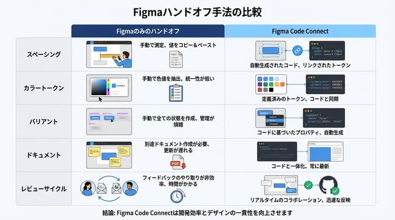 Code Connectを設計システム全体に入れると、往復回数の減少、実装の揃い、開発サイクル短縮、ドキュメントの自動更新が起きやすい。